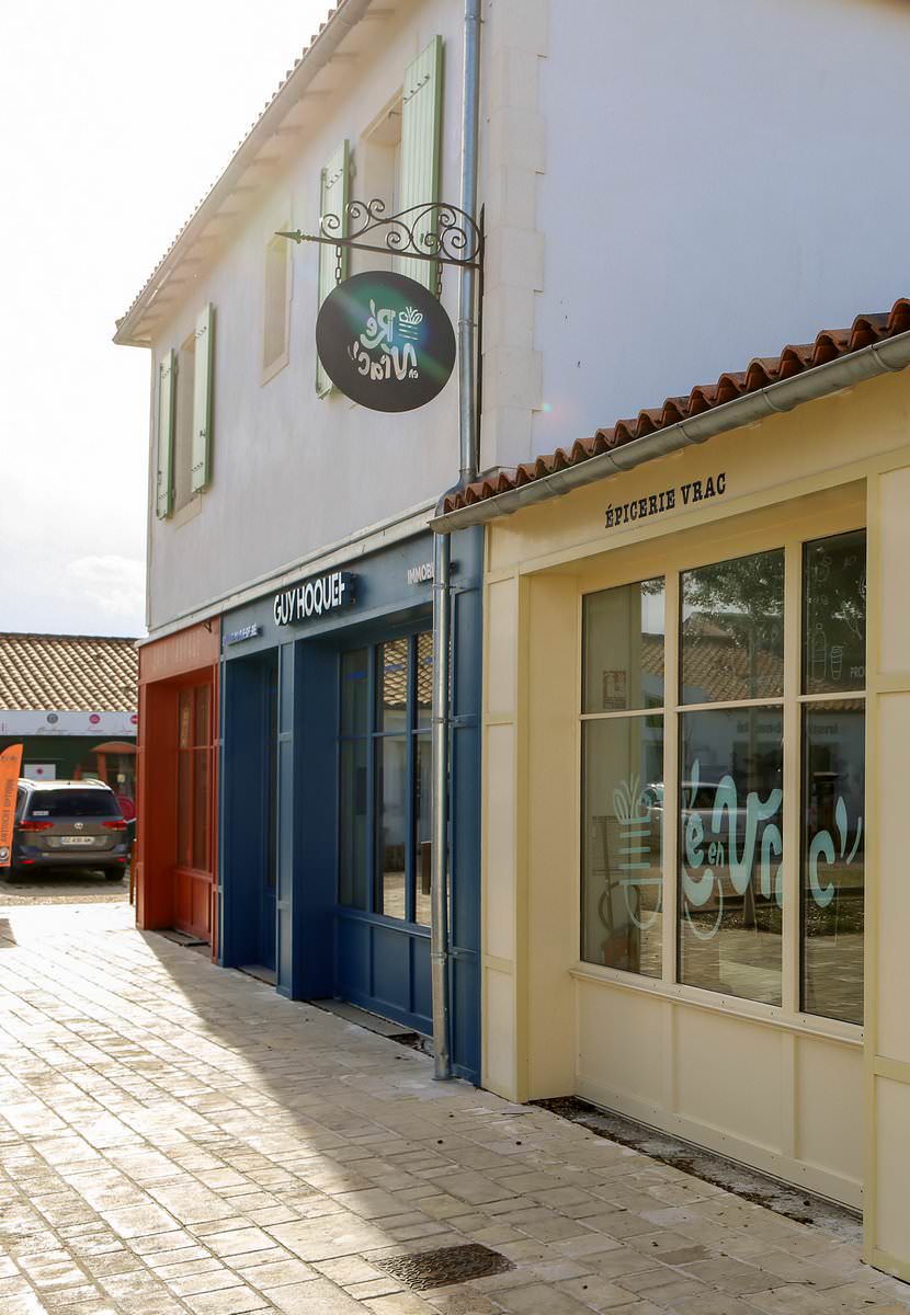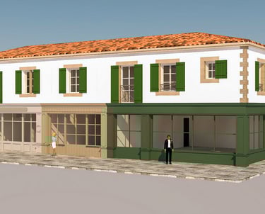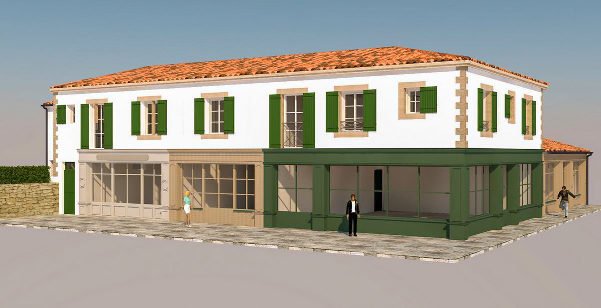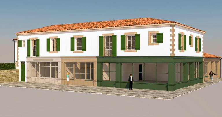 Conformément à la typologie locale, une modénature spécifique à chaque commerce sera prévue en caissons et coffrages en bois rapportés pour l’habillage de chacune des façades commerciales; les structures des coffrages seront en applique rapportées, aux panneaux moulurés et différents à chacun des commerces, avec des vitrines en tableaux légèrement en retrait de la façade principale, de part et d’autre d’une entrée centrale .