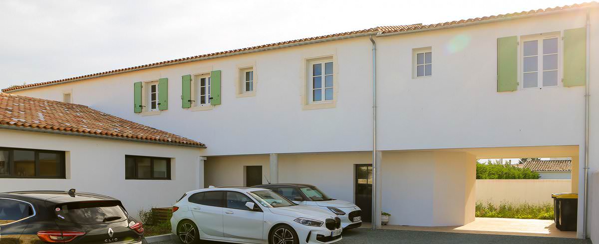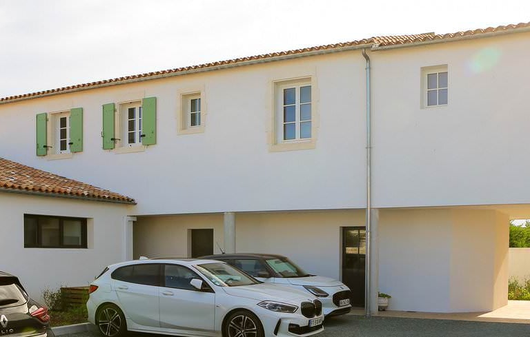 La maçonnerie des bâtiments est recouverte d’un enduit blanc lissé plat réalisé à la truelle.