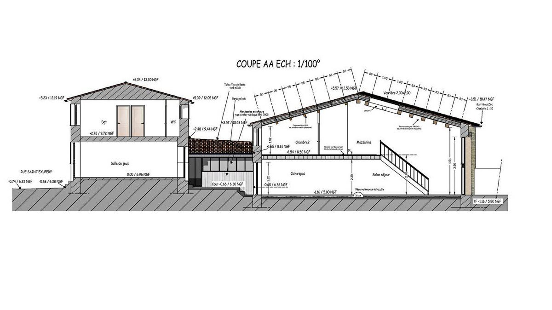 La pente de la toiture sera conservée à l’existant , celle-ci étant comprise entre 28 et 30 pour cent. La couverture sera réalisée en tuiles tige de botte à plusieurs tons mêlés et vieillis ou de réemploi. Les tuiles anciennes seront posées en chapeau sur des tuiles en courant neuf de teintes vieillies et mêlées. Les rives sur pignon seront réalisées à la réthaise.