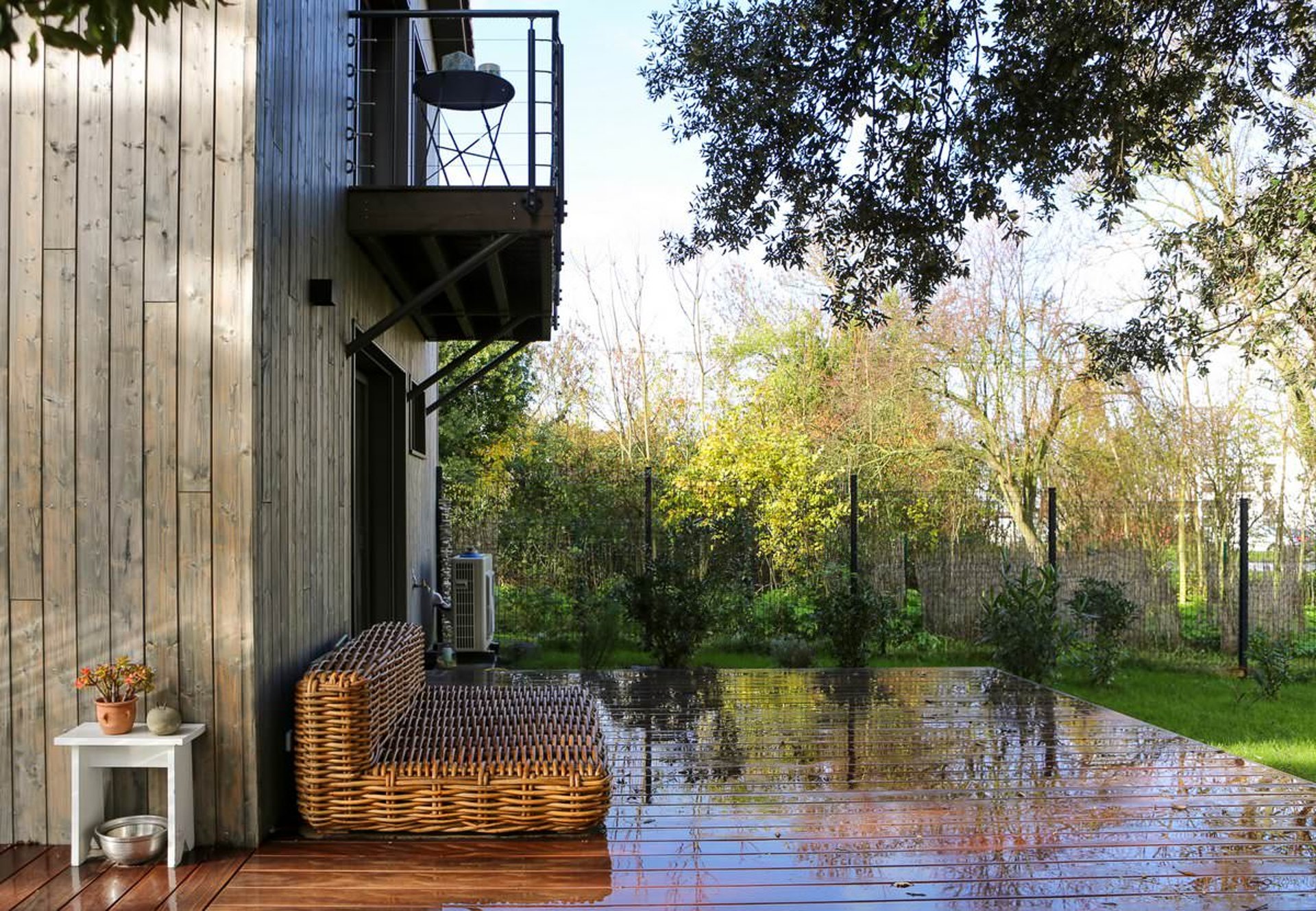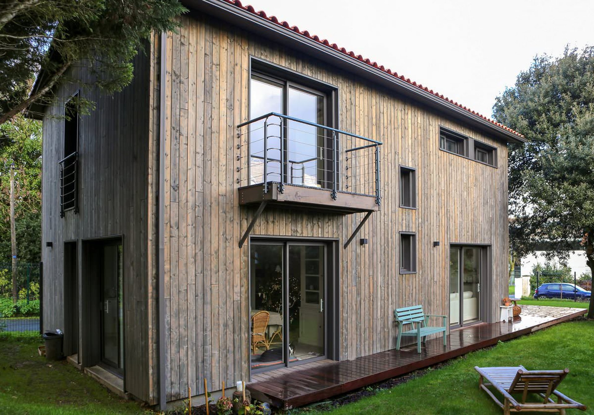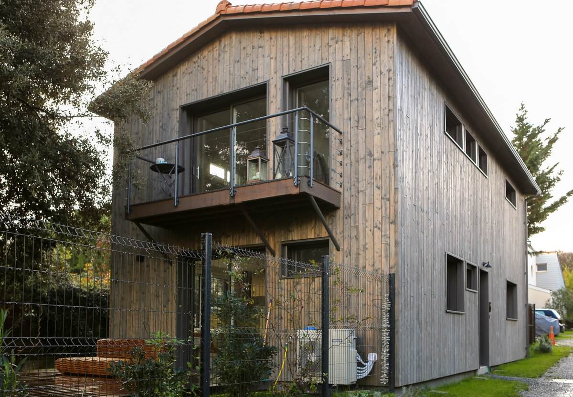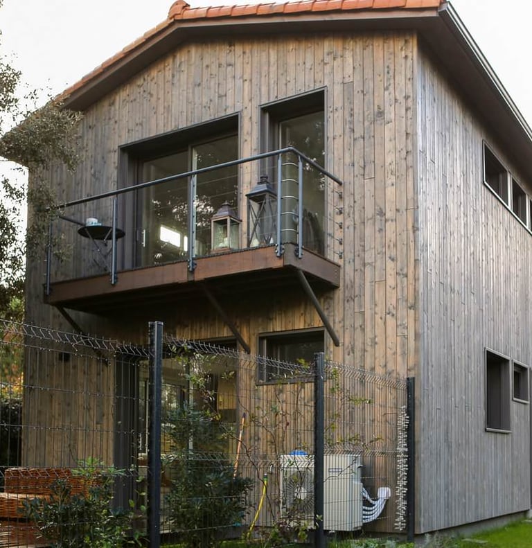 Les balcons sont projetés en bois, et édifiés sur consoles. Les garde-corps sont métalliques, RAL 7005. Les terrasses sur balcons et au rez-de-chaussée sont en bois, teinte naturelle.