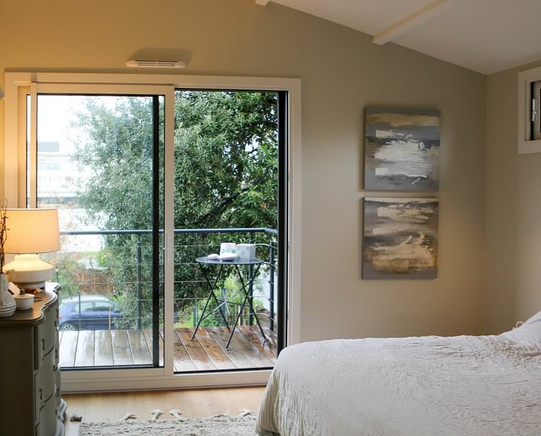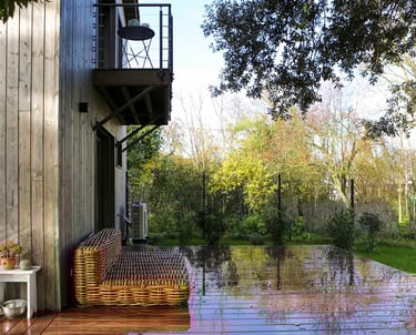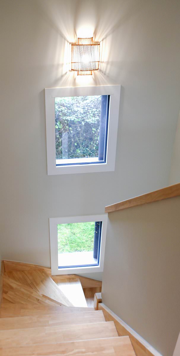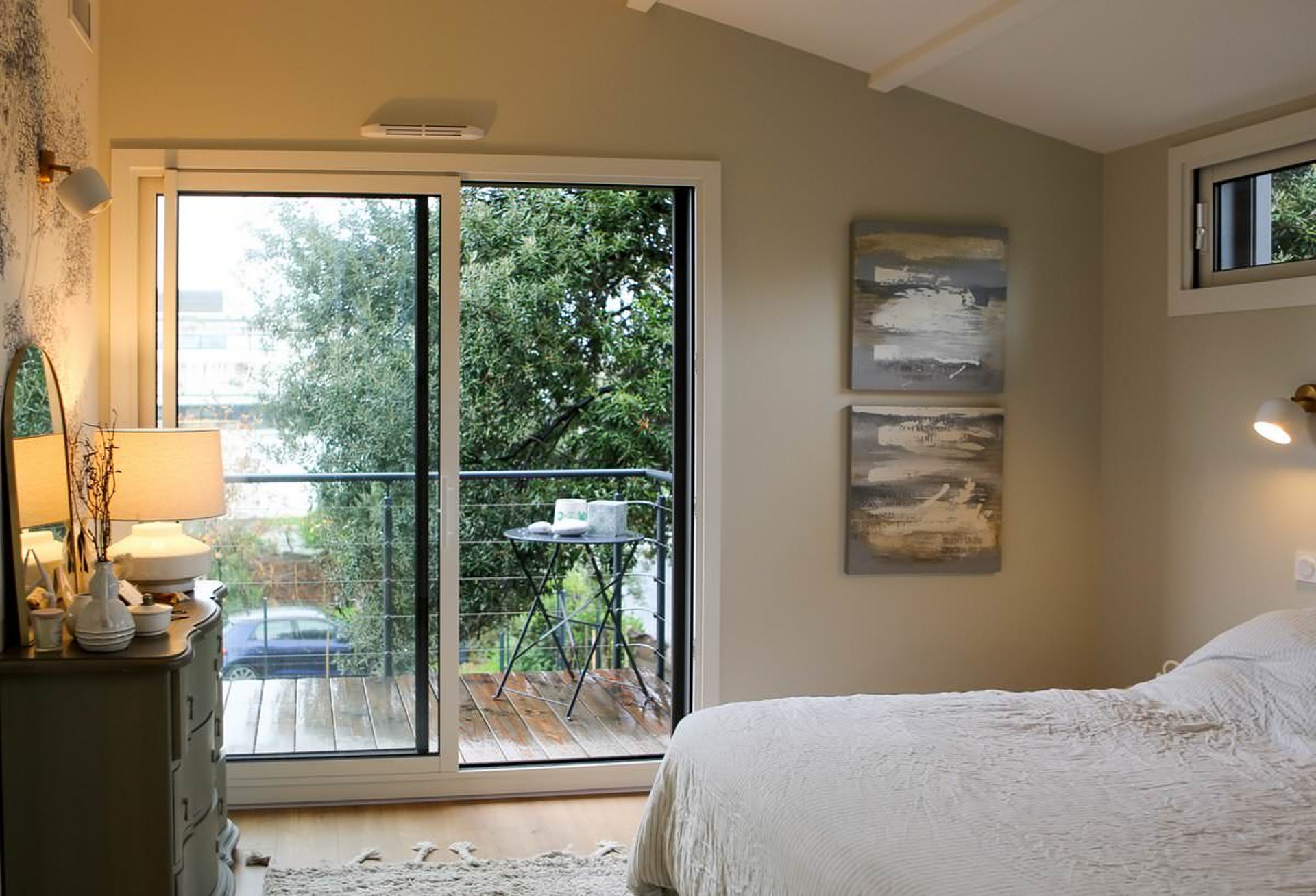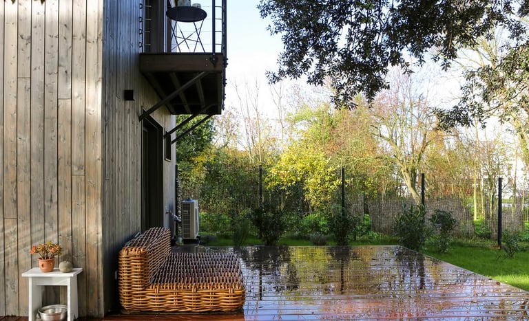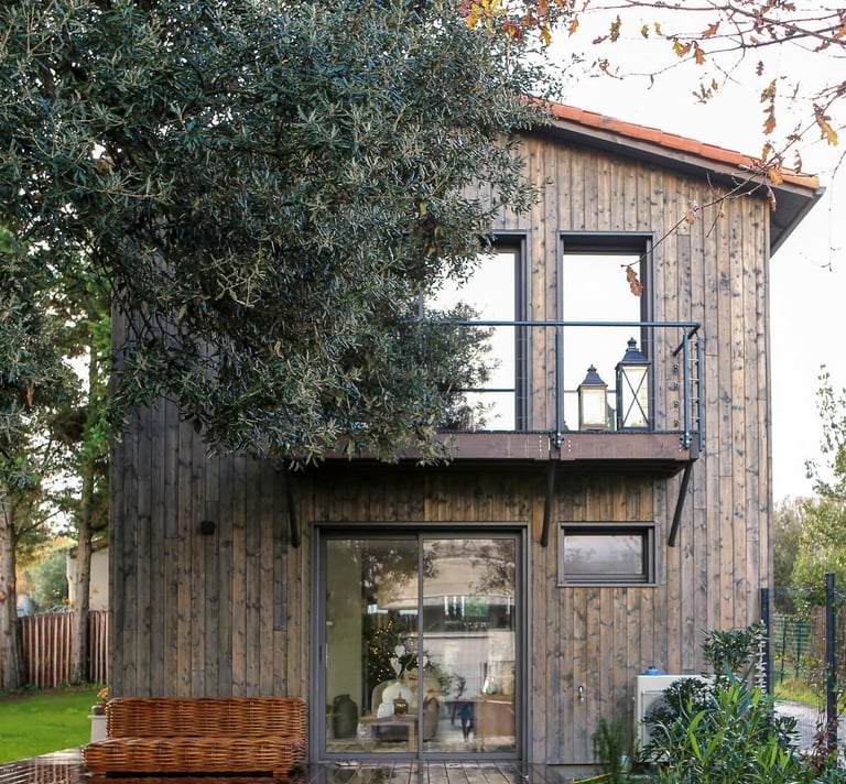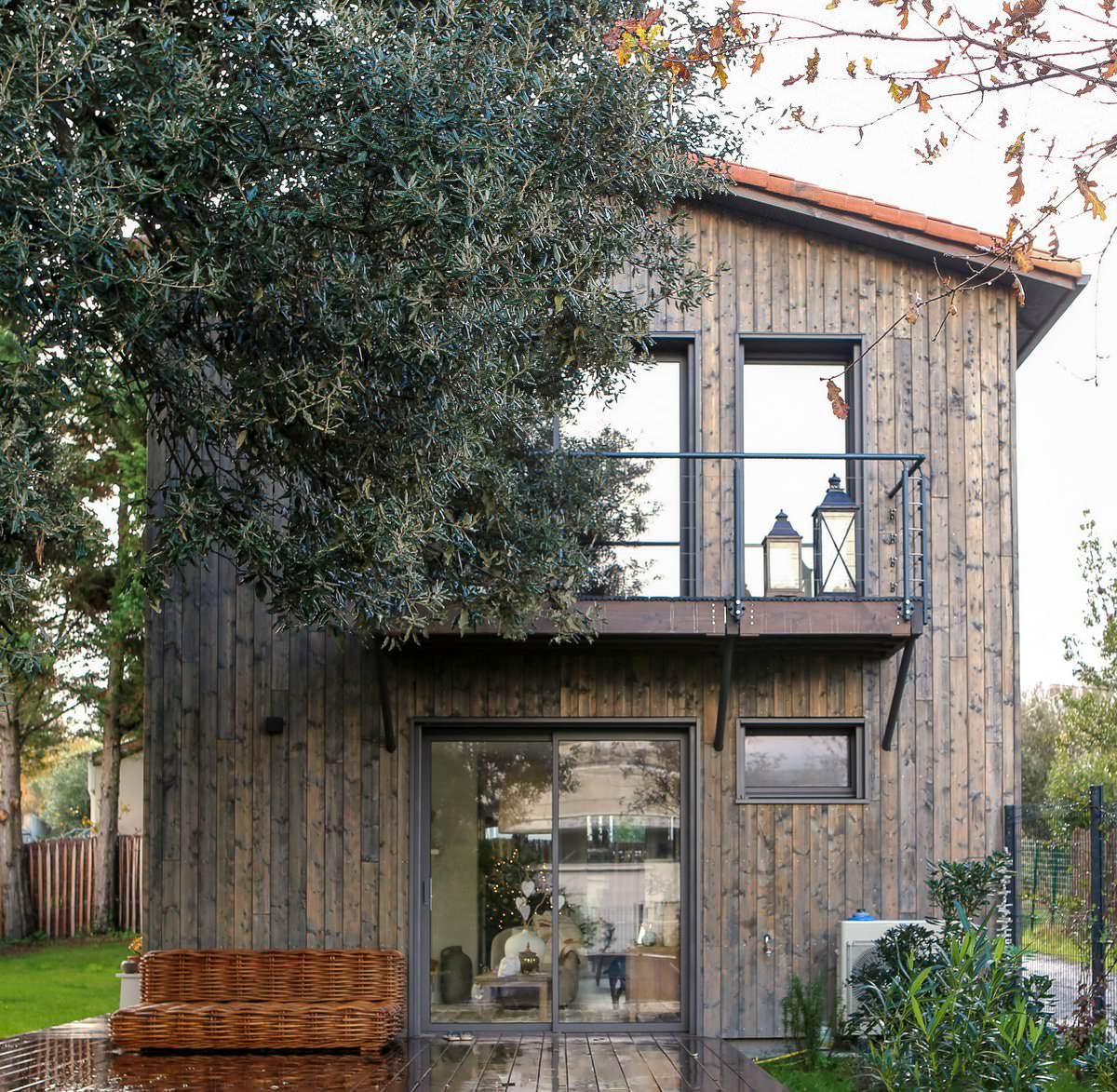 Les balcons sont projetés en bois, et édifiés sur consoles. Les garde-corps sont métalliques, RAL 7005. Les terrasses sur balcons et au rez-de-chaussée sont en bois, teinte naturelle.