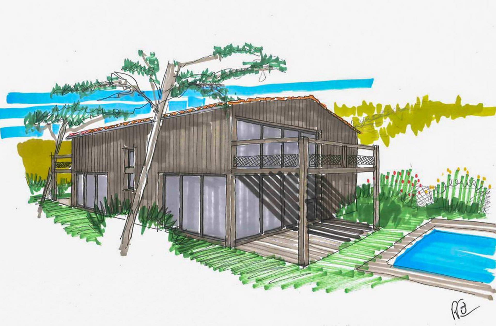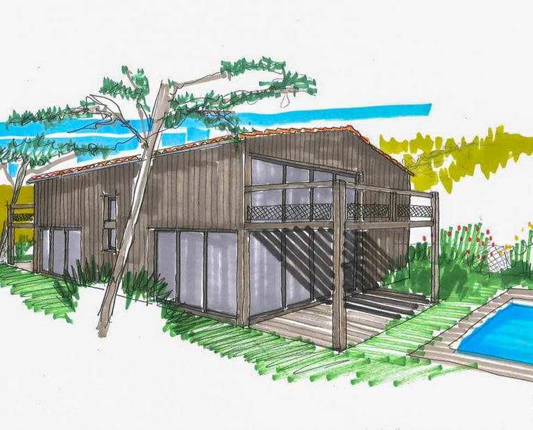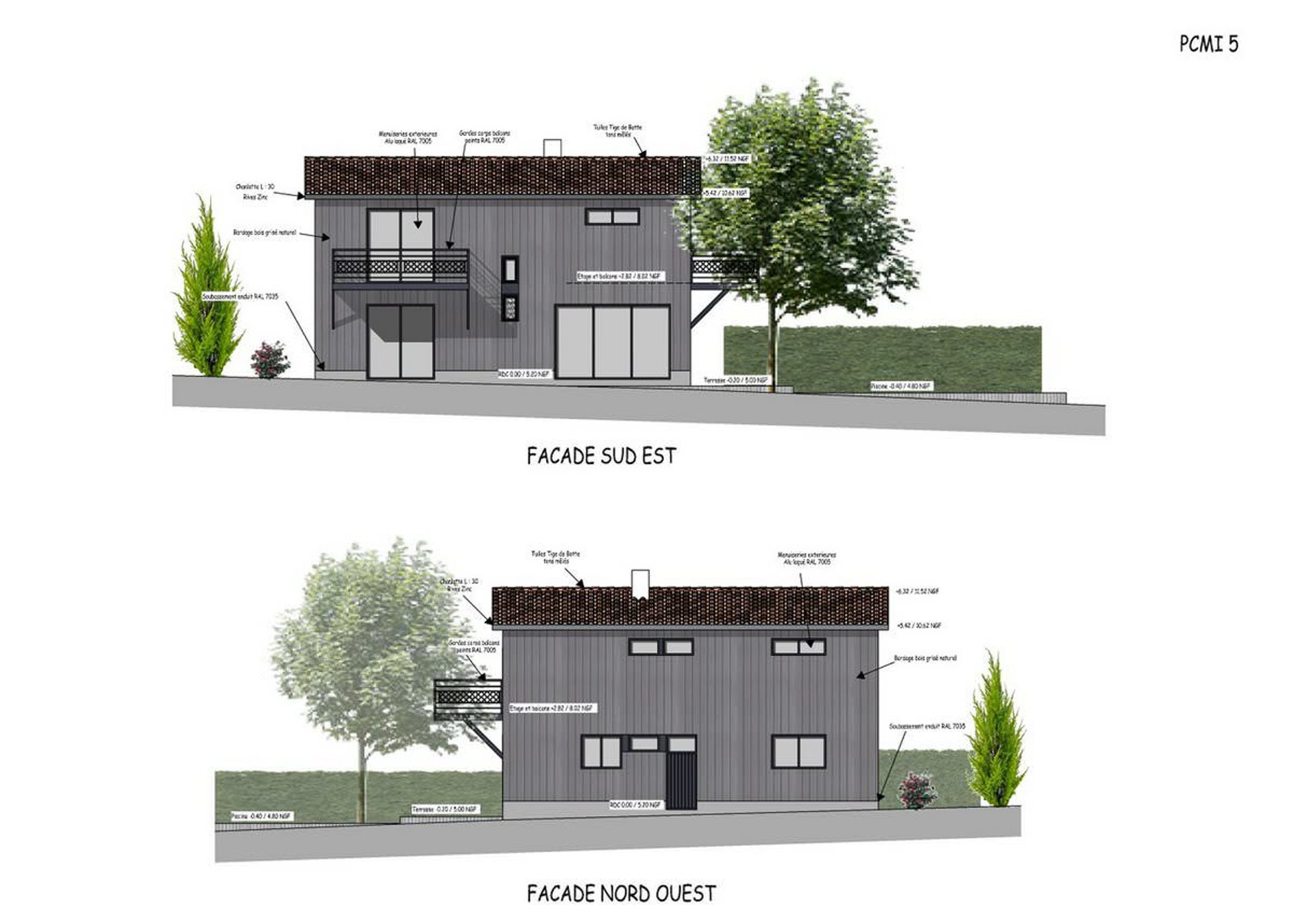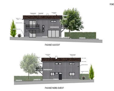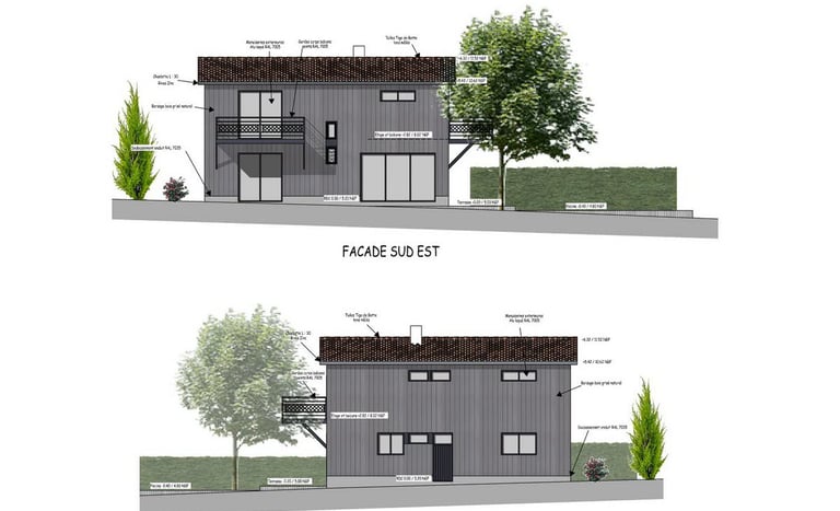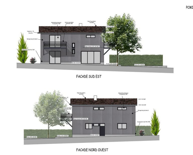 Le projet est prévu en ossature bois, avec un bardage Red Cedar (cèdre rouge) avec lames en couvre-joint. Le bardage sera de teinte grisée au naturel.