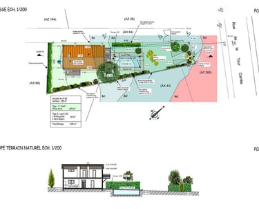 L’implantation choisie vient s’insérer au mieux dans son environnement immédiat, constitué essentiellement d’arbres à conserver et d’un espace naturel et boisé à mettre en valeur.
