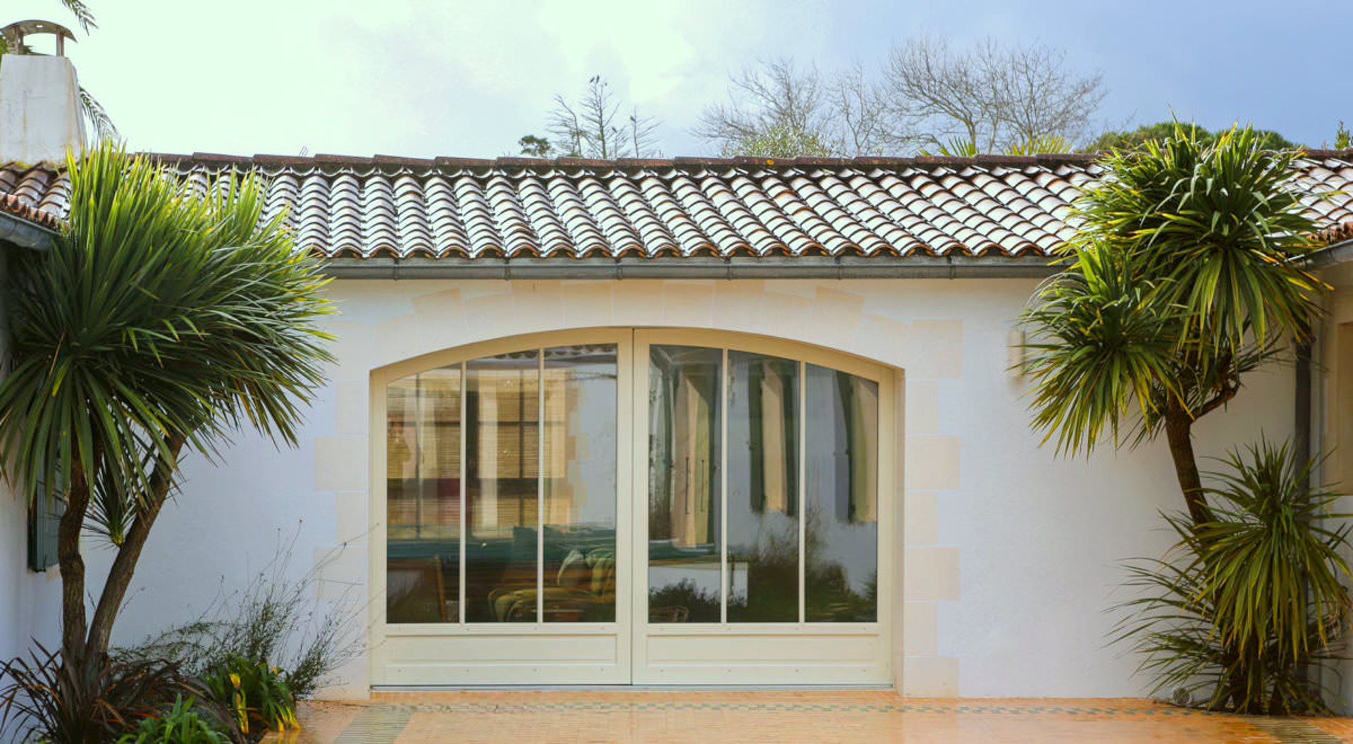 Deux ouvertures en pierres massives sont projetées dans la cour intérieure, sur la baie diminuée du jardin d’hiver (façade SUD-OUEST), et sur la baie créée du séjour côté piscine (façade NORD-EST).