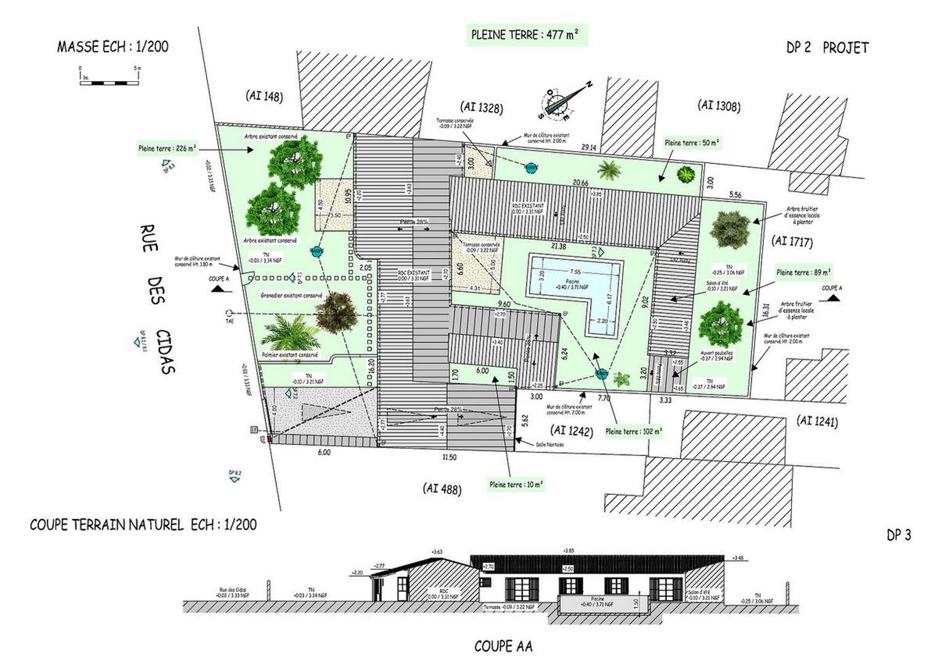 L’enjeu du permis est de retrouver un espace de pleine terre de façon à répartir les bâtiments en patio autour de la piscine qui sera restaurée et carrelés en essayant de reproduire un drapé. De nombreuses ouvertures sont réalisées autour du patio.