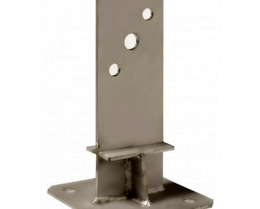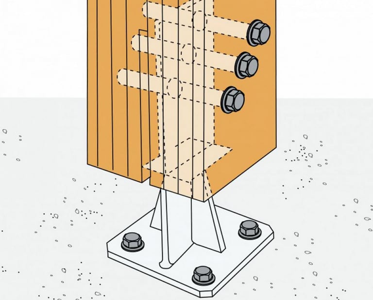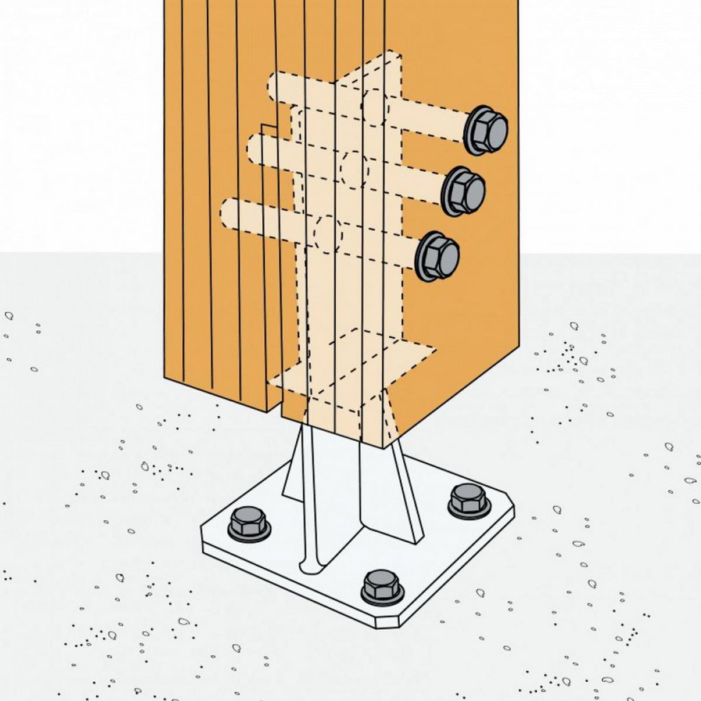 La structure bois sera désolidarisée du sol. Chaque poteau de 15 x 15 sera placé sur sabot métallique inox invisible boulonné au sol.